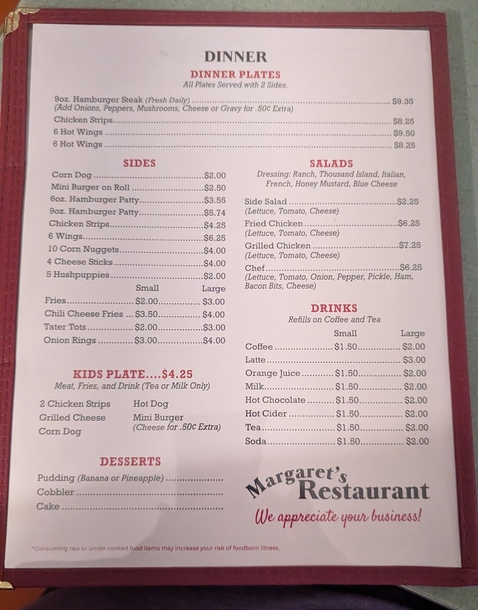 In essence, Margaret’s Restaurant is more than just a place to eat—it is a celebration of community and comfort food that leaves every guest with a smile. Whether it's your first visit or you're a returning fan, this charming diner promises to satisfy your cravings and make you feel right at home.